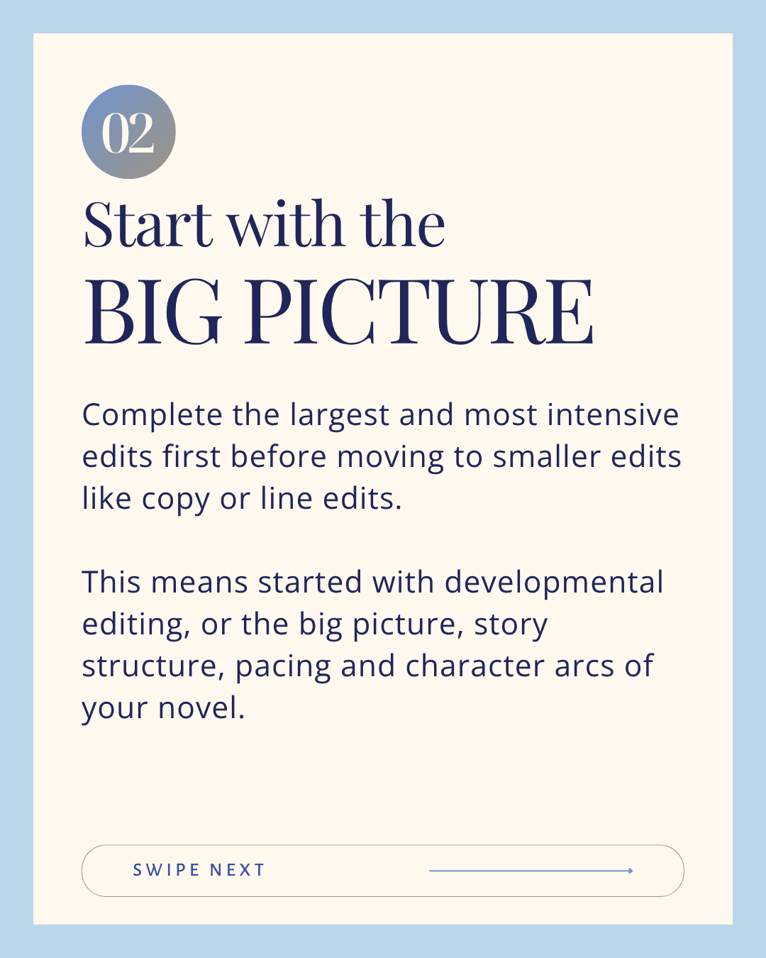 When you start to edit a novel, it's a best practice to complete the largest and most intensive edit first before moving to smaller edits like copy or line edits. This means started with developmental editing, or the big picture, story structure, pacing and character development of your novel.