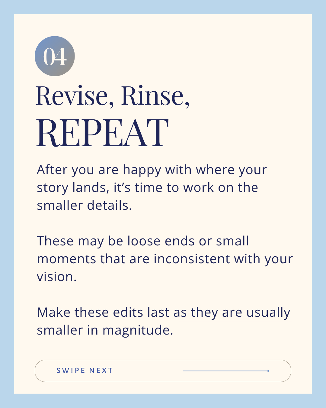 After you are happy with where your story lands, it’s time to work on the smaller details. These may be loose ends or small moments that are inconsistent with your vision.