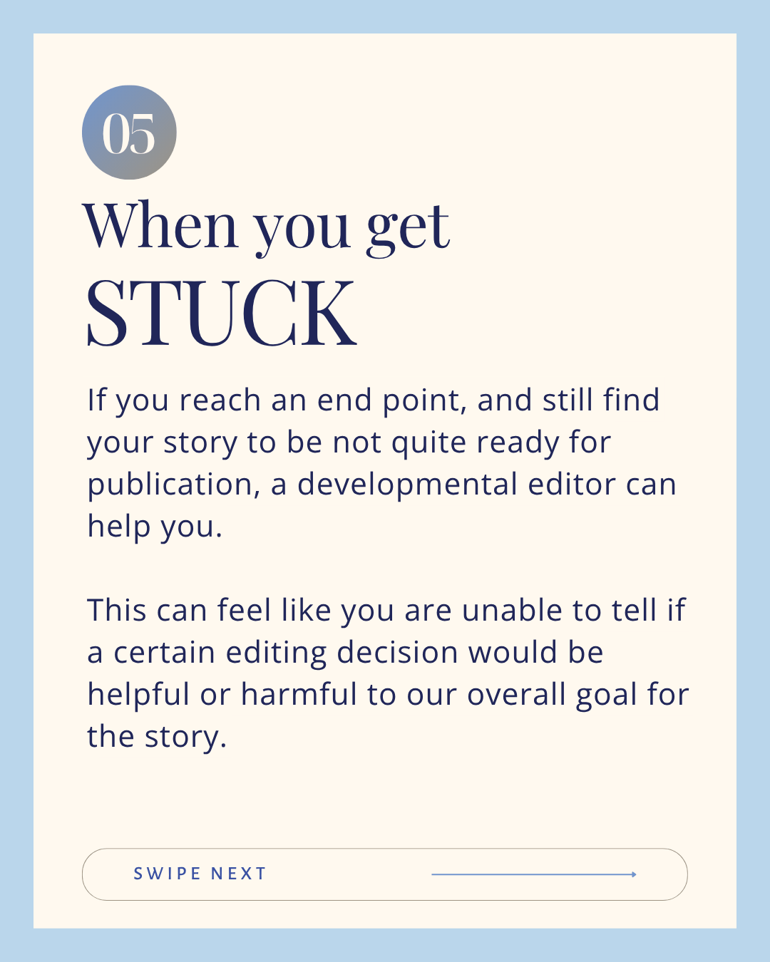 If you reach this point, and still find your story to be not quite ready for publication, a developmental editor can help you. Feedback from beta readers is great until you find yourself completely stuck. At this point, it's time to call a professional for help.