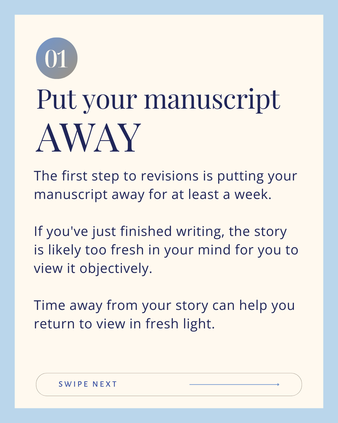 The first step to revisions is putting your manuscript away for at least a week. If you've just finished writing, the story is likely too fresh in your mind for you to view it objectively. Time away from your story can help you return to view in fresh light.